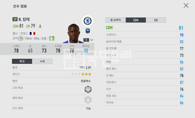 ▲ 피파온라인4 N. 캉테의 클래스별 능력치