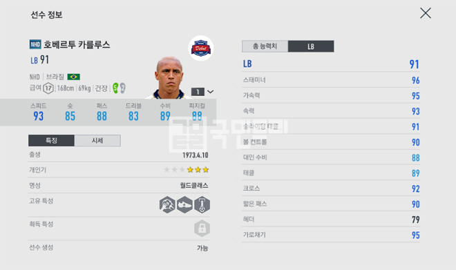 ▲ 피파온라인4 NHD 호베르투 카를루스의 능력치