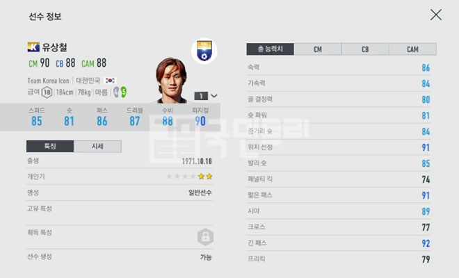 마지막 자리는 TKI 유상철이 차지했다. CDM과 함께 CM, CAM, CB까지, 공격수를 제외한 중앙 포지션을 모두 볼 수 있는 게 장점이다. 패스 능력치가 90을 넘고 4-5의 준 양발잡이로 중원 사령관 역할을 수행할 수 있다.