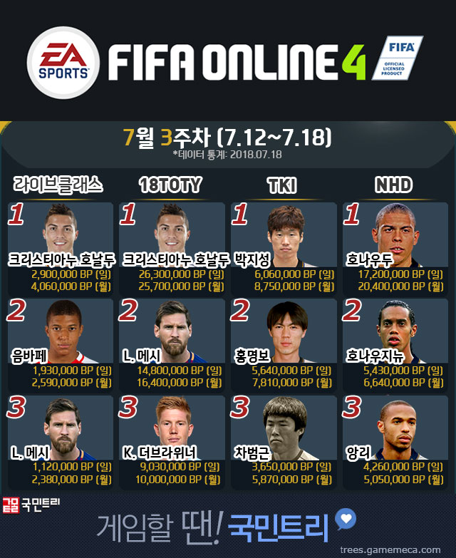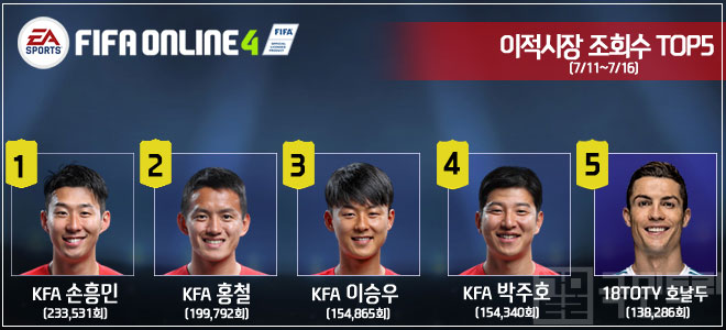 금주의 피파온라인4 이적시장 조회수 순위입니다. 지난 7/14~15일 이틀간 ‘FIFA 월드컵 결승전야제 핫타임’ 이벤트를 실시했는데요. 이벤트 보상으로 2018 KFA 세 장과 행운의 BP카드(5만~100만BP) 카드를 제공하고, PC방에서 누적 접속 보상으로 50만 BP를 추가 지급했죠. 이벤트 보상 때문인지 이적시장에 KFA 카드의 판매량와 조회수가 늘어나 랭킹 TOP5에 KFA 시즌이 계속해서 자리하고 있습니다.