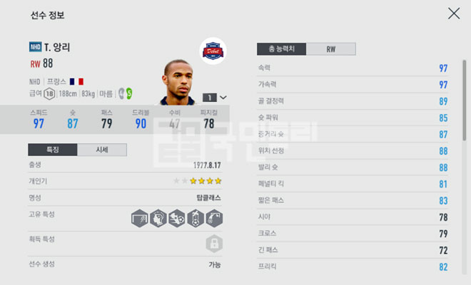 그럼 본격적으로 순위표를 살펴보겠습니다. 먼저 이번 주 이적시장 몸값 순위입니다. NHD 시즌에 새로운 얼굴이 순위에 등장했습니다. 바로 ‘앙리’인데요. 벨기에 대표팀의 코치로 이번 월드컵에 참가해 눈길을 끌었죠. ‘속가’ 스탯 97로 빠른 체감과 ‘예리한 감아차기’, ‘화려한 개인기’, ‘스피드 드리블러’까지 공격수에게 좋은 특성들을 가지고 있어 대장급 윙이 필요하신 분들에게 인기를 끌고 있습니다.