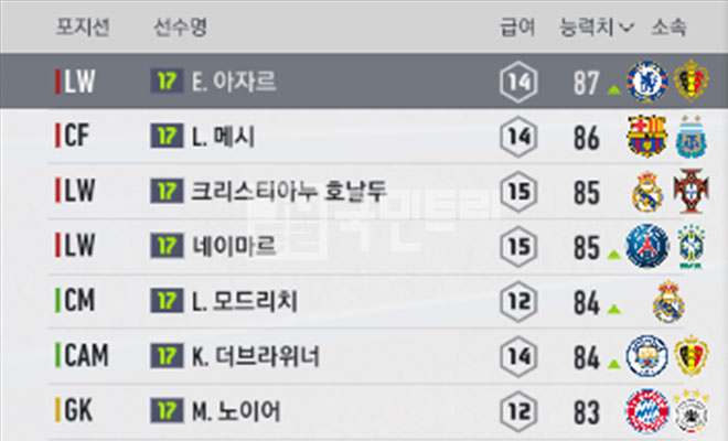 ▲ 피파온라인4 17 라이브 클래스 능력치 순위