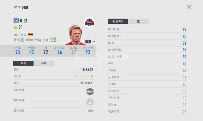 KFA의 인기가 계속되는 가운데 최근 이적시장 조회수에 조금씩 변동이 생기고 있습니다. NHD 호나우두, 칸, 호나우지뉴, 호베르투 카를루스 등 유명 선수들의 조회수가 상승했는데요. 그 중에서 NHD O. 칸에 눈길이 갑니다. 1강 능력치가 다이빙 93, 핸들링 85, 반응속도 96, 위치 선정 93이라는 높은 수치를 자랑합니다. 또한, 고유 특성에 ‘GK 능숙한 펀칭’이 있죠. 가격은 200만BP를 훌쩍 넘지만 키퍼 능력을 중요하게 생각하신다면 영입을 추천합니다.