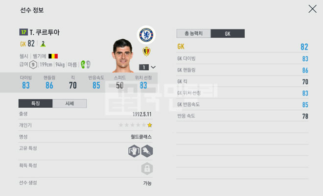 우선 쿠르투아부터 살펴보겠습니다. NHD와 라이브, 두 클래스가 있는데요. 라이브가 급여9로 상대적으로 낮고 전반적인 능력치가 더 높기 때문에 많은 사람이 라이브를 선호하죠. 고유 특성에 ‘적극적 크로스 수비’와 ‘멀리 던지기’가 있는데요. 멀리 던지기 특성을 이용해 빠른 역습을 만들수 있기 때문에 또다른 공격 옵션을 제공하는 골키퍼로 인기가 높습니다.