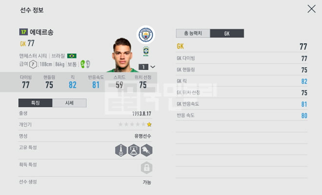에데르송은 반응속도 81, GK 다이빙 77로 준수한 능력치를 가지고 있는데요. 고유 특성에 ‘스위퍼 키퍼’, ‘GK 적극적 크로스 수비’를 가져 넓은 수비 범위를 필요로 하는 분들에게 제격인 골키퍼입니다.