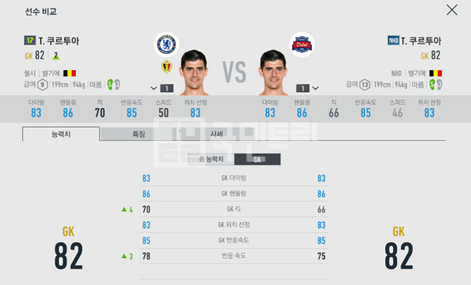 ▲ 피파온라인4 17쿠르투아, NHD 쿠르투아의 능력치 비교