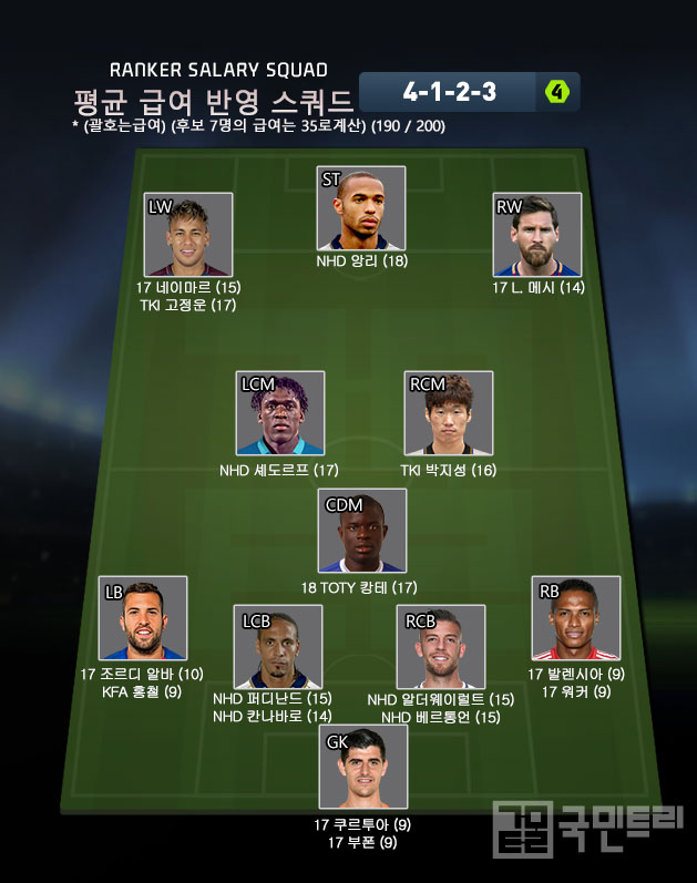 ▲ 피파온라인4 랭커 70인의 평균 급여로 만든 4-1-2-3 포메이션 스쿼드