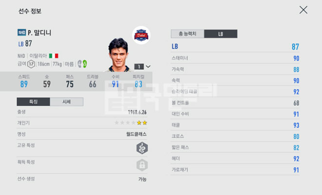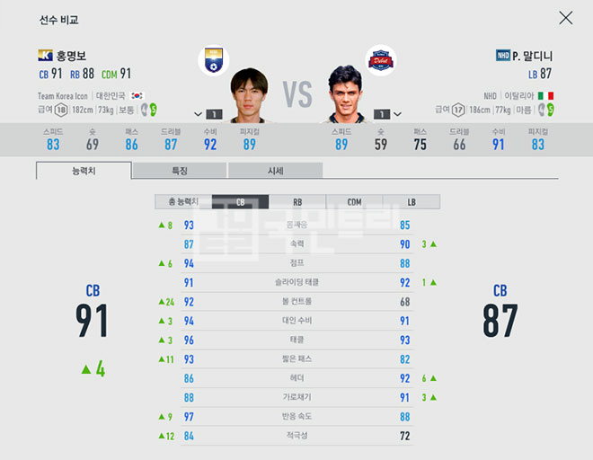 ▲ 피파온라인4 TKI 홍명보, NHD 말디니의 능력치 비교