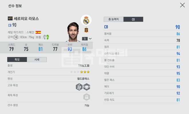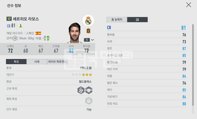 18 TOTY 라모스도 인기를 누리고 있다. 고유 특성 ‘파워 헤더’로 세트피스 상황에서 좋고, 대부분 수비 능력치가 90으로 상당히 뛰어나다. 다만 ‘속가’가 78, 81로 약간 느리고 18의 높은 급여가 단점으로 꼽힌다. 만약 BP가 부족한 유저라면 NHD나 17시즌을 사용해도 좋다. 이 가운데 17 시즌은 ‘라이브 퍼포먼스’ 효과가 적용되어 가격이 조금씩 상승하는 모습이니 참고하자.