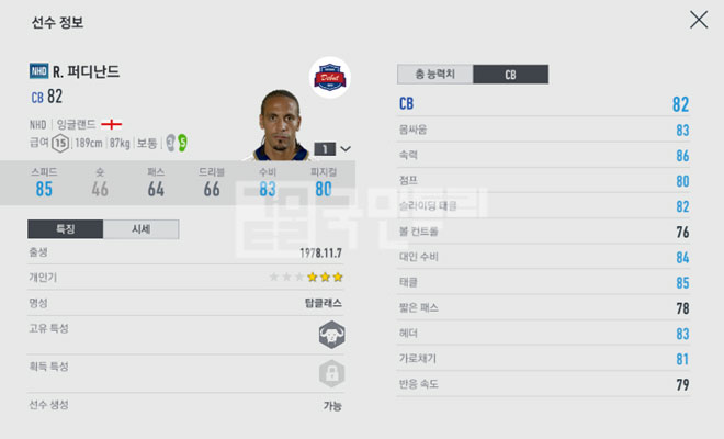 ▲ 피파온라인4 NHD 퍼디난드의 능력치