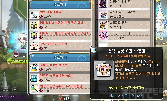 선택 슬롯 8칸 확장권은 캐릭터 장비, 소비, 설치, 기타 슬롯 중 원하는 종류 하나를 8칸 늘려주는 아이템이다. 해당 아이템은 캐시로 매우 비싼 값에 구할 수 있기 때문에 만약 인벤토리가 부족하다면 이번 기회에 장만하는 걸 추천한다. 추가로 월드 내 나의 캐릭터간 이동 가능한 아이템이라 부 캐릭터로 구매한 다음 본 캐릭터로 옮길 수 있다. 부 캐릭터로 염원 수치를 모을 수 있는 유저라면 이를 활용하자.