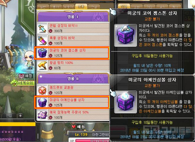 등급업을 하고 남은 훈장은 ‘코어 젬스톤’과 ‘선택형 아케인 심볼’ 구매에 소모하는 걸 추천한다. 각 아이템은 원킬 사냥을 위한 가장 쉬운 스펙업 방법이며, 아케인 리버 지역 이후로 꾸준히 필요하기 때문에 많을수록 좋다.