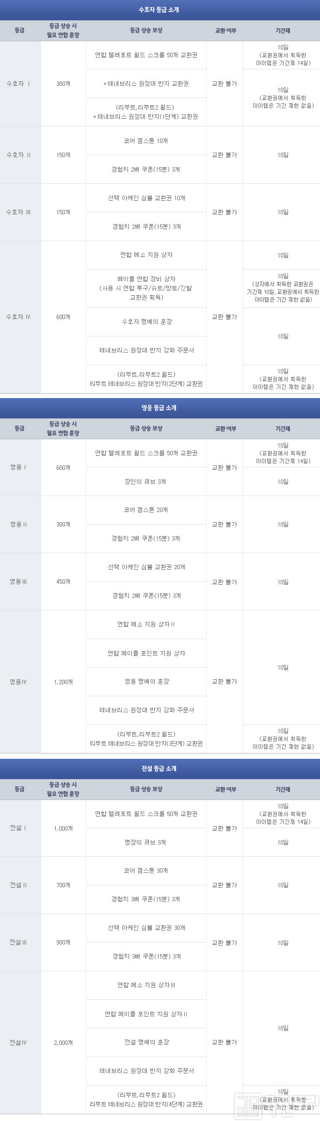 더불어 연합 등급은 월드 내 나의 모든 캐릭터가 공유하기 때문에 여건이 된다면 부 캐릭터로 높이고 보상은 본 캐릭터로 받는 걸 추천한다. 단, 등급은 하루에 최대 1단계까지만 높일 수 있으므로 한 번에 몰아서 올리지 말고 매일 꾸준히 높이자.