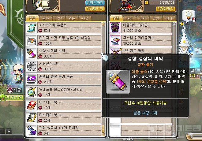 만약 아직 ‘포켓 슬롯’ 퀘스트를 수행하지 않았다면, ‘성향 성장의 비약’을 구매하자. 퀘스트를 받기 위해선 매력 레벨 30이 필요한데, 비약을 하나만 섭취해도 바로 해당 조건을 맞출 수 있다. 퀘스트로 슬롯을 개방해야 포켓 아이템을 착용할 수 있으므로 아직 하지 않았다면 최우선 수행을 권한다.
