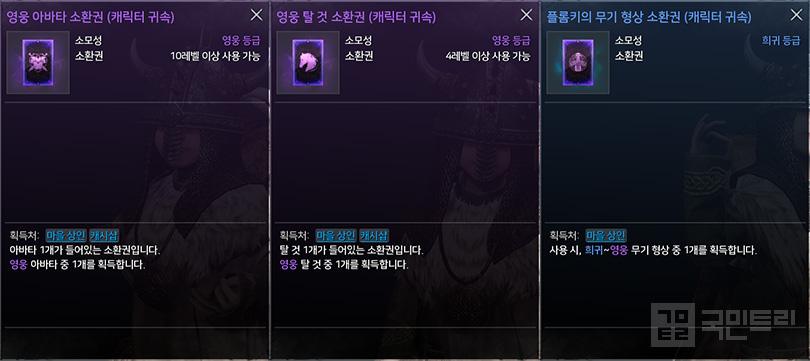 이미 영웅 등급 아바타/탈 것을 갖고 있는 유저라면 앞서 아바타 교환에서 언급한 ‘보유 효과’를 보고 선택하자. 아바타와 탈 것 보유 효과 둘 다 중요한 옵션을 제공하지만 아바타 6개 보유 효과로 얻는 명중 +3이 더 중요하기 때문에 우선 아바타 소환권으로 교환하는 것을 추천한다.