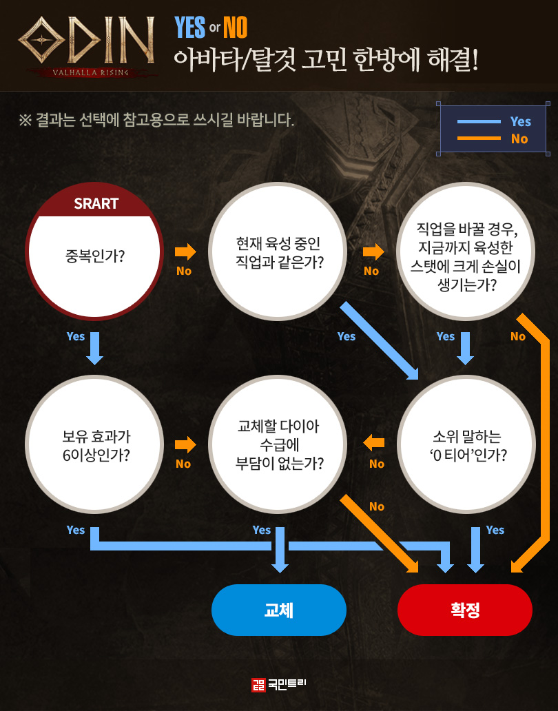 '아바타/탈 것' 교체 여부는 가장 많은 유저가 고민하고 의견을 구하는 사항이다. 오딘에서는 소환권으로 영웅 등급 이상 아바타나 탈 것을 획득했을 때 다이아를 소모해 교체할 수 있는 기회가 주어진다. 교체를 시도할 경우 현재 플레이 중인 캐릭터 직업군의 아바타를 무작위로 얻을 수 있다. 직업, 티어 등 모든 것이 변하는데, 다이아까지 소모해야 하니 보다 신중해질 수밖에 없다.