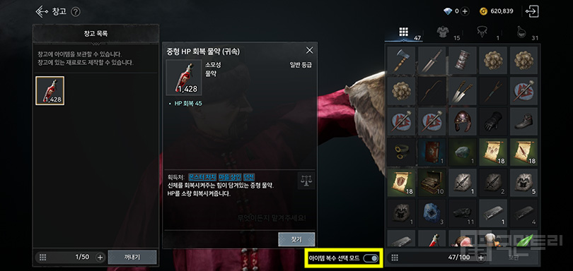 방법은 간단하다. 창고 화면 하단 중앙 쪽에 ‘아이템 복수 선택 모드’라는 체크 항목을 활용하는 것이다. 이를 해제하고 찾으려는 물약을 누른 뒤 ‘꺼내기’ 버튼을 터치하면 된다. 그 다음에 ‘찾기’ 버튼을 누르면 개수를 지정해서 아이템을 찾을 수 있다. 물약 뿐 아니라 강화석, 제작 재료 등 한 슬롯에 아이템을 여러개 소지할 수 있는 아이템이라면 가능하니 참고하자.